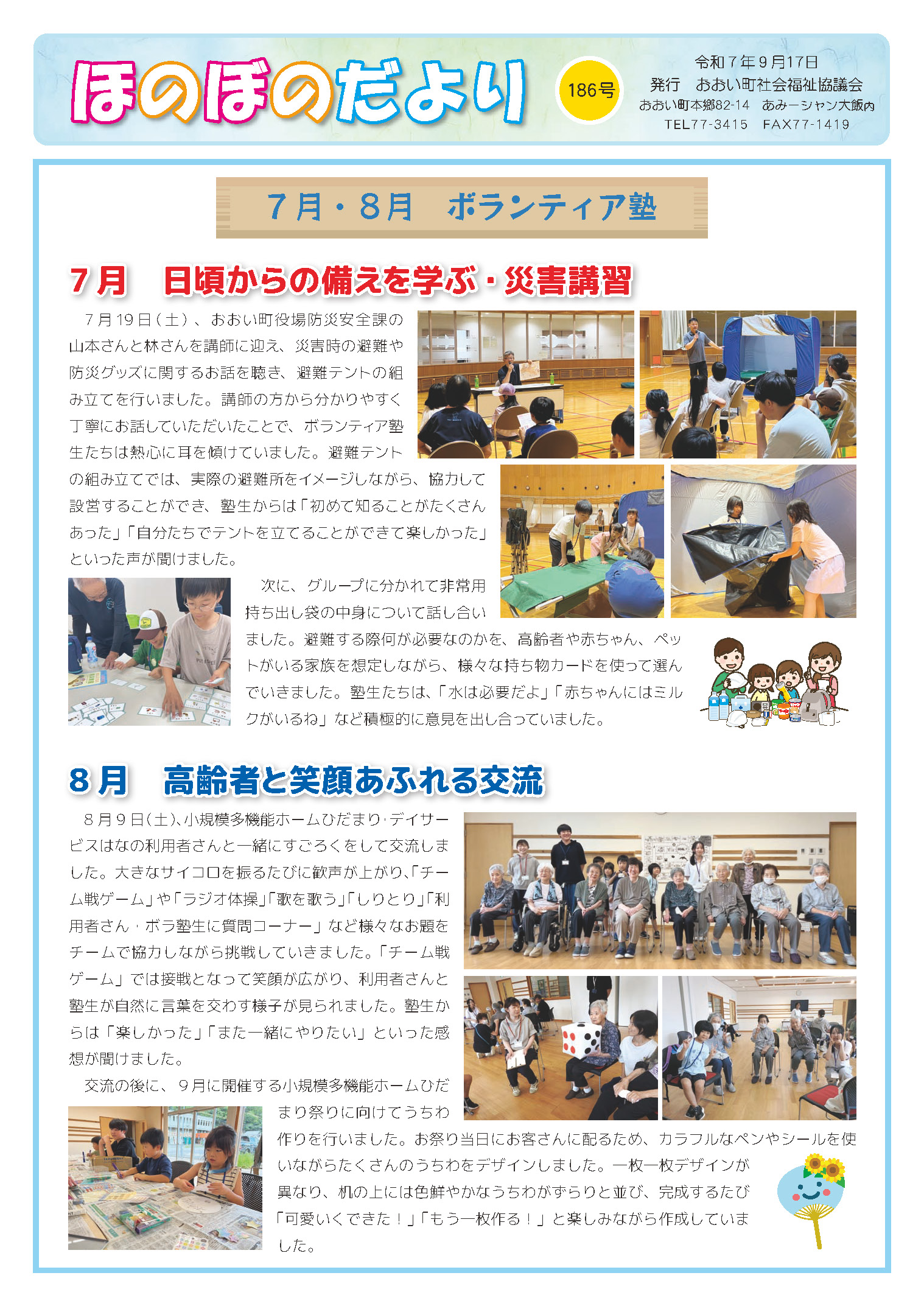 広報誌ほのぼのだより最新号 「ほのぼのだより186号」 (2025年9月 発行) – 内容 –7・8月ボランティア塾9~10月の無料法律相談のお知らせ夏のイベントぞくぞく開催!バックナンバー広報誌「ほのぼのだより185号」広報誌「ほのぼのだより184号」広報誌「ほのぼのだより183号」広報誌「ほのぼのだより182号」広報誌「ほのぼのだより181号」広報誌「ほのぼのだより180号」広報誌「ほのぼのだより179号」広報誌「ほのぼのだより178号」広報誌「ほのぼのだより177号」広報誌「ほのぼのだより176号」広報誌「ほのぼのだより175号」広報誌「ほのぼのだより174号」広報誌「ほのぼのだより173号」広報誌「ほのぼのだより172号」広報誌「ほのぼのだより171号」広報誌「ほのぼのだより170号」広報誌「ほのぼのだより169号」広報誌「ほのぼのだより168号」広報誌「ほのぼのだより167号」広報誌「ほのぼのだより166号」広報誌「ほのぼのだより165号」広報誌「ほのぼのだより164号」広報誌「ほのぼのだより163号」広報誌「ほのぼのだより162号」広報誌「ほのぼのだより161号」広報誌「ほのぼのだより160号」広報誌「ほのぼのだより159号」広報誌「ほのぼのだより158号」広報誌「ほのぼのだより157号」広報誌「ほのぼのだより156号」広報誌「ほのぼのだより155号」広報誌「ほのぼのだより154号」広報誌「ほのぼのだより153号」おおい町社協だより最新号 「社協だより tunagu-つなぐ- 第56号」 (2024年8月 発行) – 内容 –ふくしのたね赤い羽根共同募金運動賛助会員一覧写真投稿コーナー「コレ推し」元気アップ体操無料法律相談バックナンバー広報誌「社協だより tunagu-つなぐ- 第55号」広報誌「社協だより tunagu-つなぐ- 第54号」広報誌「社協だより tunagu-つなぐ- 第53号」広報誌「社協だより tunagu-つなぐ- 第52号」広報誌「社協だより第51号」広報誌「社協だより第50号」広報誌「社協だより第48号」広報誌「社協だより第47号」広報誌「社協だより第46号」広報誌「社協だより第45号」広報誌「社協だより第41号」広報誌「社協だより第40号」広報誌「社協だより第39号」広報誌「社協だより第38号」広報誌「社協だより第37号」広報誌「社協だより第36号」広報誌「社協だより第34号」広報誌「社協だより第33号」広報誌「社協だより第32号」広報誌「社協だより第31号」広報誌「社協だより第30号」広報誌「社協だより第29号」広報誌「社協だより第28号」広報誌「社協だより第27号」広報誌「社協だより第26号」広報誌「社協だより第25号」広報誌「社協だより第24号」広報誌「社協だより第23号」広報誌「社協だより第22号」広報誌「社協だより第21号」広報誌「社協だより第20号」広報誌「社協だより第19号」