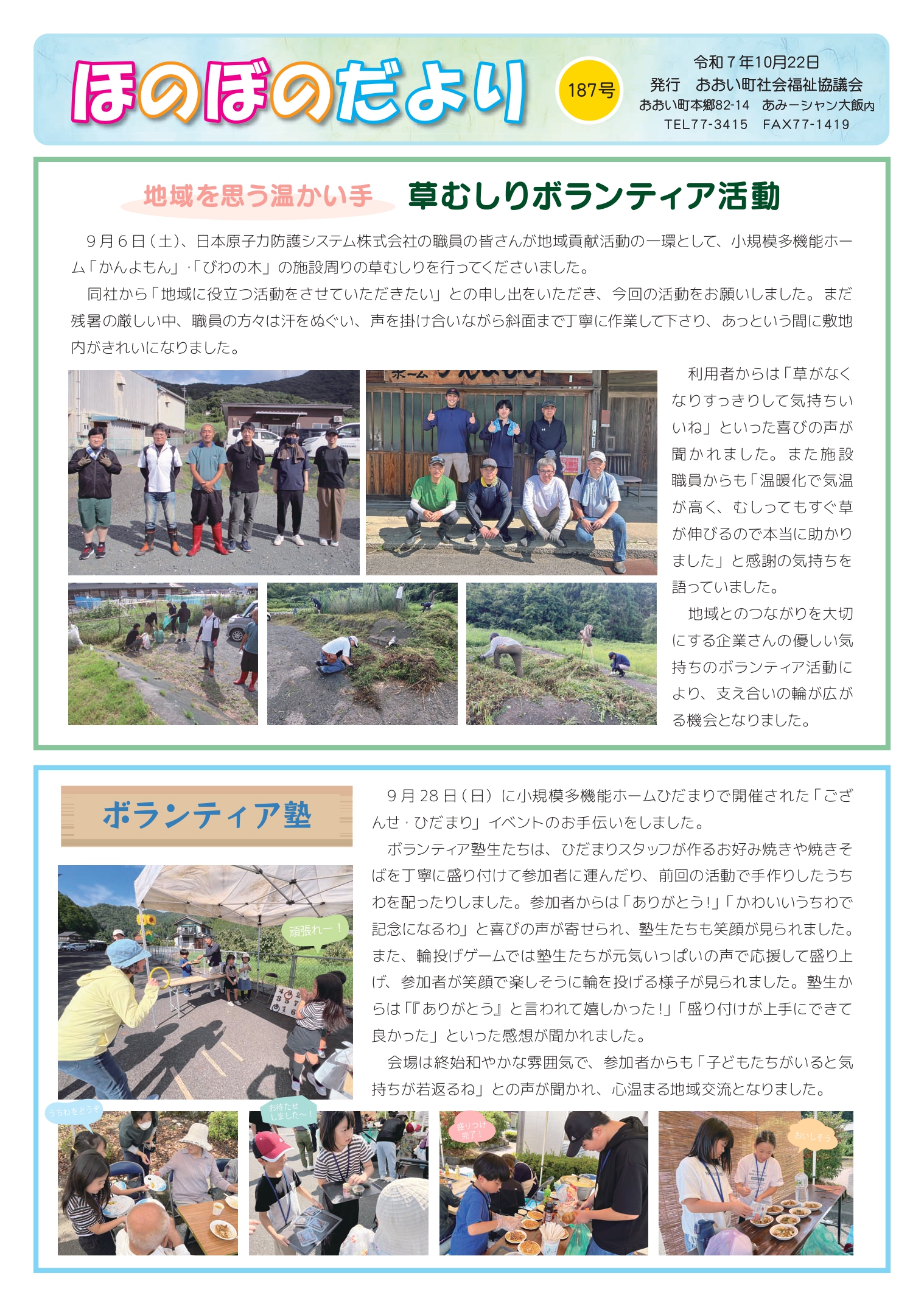 広報誌ほのぼのだより最新号 「ほのぼのだより187号」 (2025年10月 発行) – 内容 –草むしりボランティア活動ボランティア塾10月の無料法律相談のお知らせ令和7年度赤い羽根共同募金運動がスタート!バックナンバー広報誌「ほのぼのだより186号」広報誌「ほのぼのだより185号」広報誌「ほのぼのだより184号」広報誌「ほのぼのだより183号」広報誌「ほのぼのだより182号」広報誌「ほのぼのだより181号」広報誌「ほのぼのだより180号」広報誌「ほのぼのだより179号」広報誌「ほのぼのだより178号」広報誌「ほのぼのだより177号」広報誌「ほのぼのだより176号」広報誌「ほのぼのだより175号」広報誌「ほのぼのだより174号」広報誌「ほのぼのだより173号」広報誌「ほのぼのだより172号」広報誌「ほのぼのだより171号」広報誌「ほのぼのだより170号」広報誌「ほのぼのだより169号」広報誌「ほのぼのだより168号」広報誌「ほのぼのだより167号」広報誌「ほのぼのだより166号」広報誌「ほのぼのだより165号」広報誌「ほのぼのだより164号」広報誌「ほのぼのだより163号」広報誌「ほのぼのだより162号」広報誌「ほのぼのだより161号」広報誌「ほのぼのだより160号」広報誌「ほのぼのだより159号」広報誌「ほのぼのだより158号」広報誌「ほのぼのだより157号」広報誌「ほのぼのだより156号」広報誌「ほのぼのだより155号」広報誌「ほのぼのだより154号」広報誌「ほのぼのだより153号」おおい町社協だより最新号 「社協だより tunagu-つなぐ- 第56号」 (2024年8月 発行) – 内容 –ふくしのたね赤い羽根共同募金運動賛助会員一覧写真投稿コーナー「コレ推し」元気アップ体操無料法律相談バックナンバー広報誌「社協だより tunagu-つなぐ- 第55号」広報誌「社協だより tunagu-つなぐ- 第54号」広報誌「社協だより tunagu-つなぐ- 第53号」広報誌「社協だより tunagu-つなぐ- 第52号」広報誌「社協だより第51号」広報誌「社協だより第50号」広報誌「社協だより第48号」広報誌「社協だより第47号」広報誌「社協だより第46号」広報誌「社協だより第45号」広報誌「社協だより第41号」広報誌「社協だより第40号」広報誌「社協だより第39号」広報誌「社協だより第38号」広報誌「社協だより第37号」広報誌「社協だより第36号」広報誌「社協だより第34号」広報誌「社協だより第33号」広報誌「社協だより第32号」広報誌「社協だより第31号」広報誌「社協だより第30号」広報誌「社協だより第29号」広報誌「社協だより第28号」広報誌「社協だより第27号」広報誌「社協だより第26号」広報誌「社協だより第25号」広報誌「社協だより第24号」広報誌「社協だより第23号」広報誌「社協だより第22号」広報誌「社協だより第21号」広報誌「社協だより第20号」広報誌「社協だより第19号」